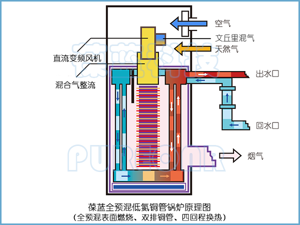 葆藍翅片銅管鍋爐四回程即使式換熱結(jié)構(gòu),燃燒室、次冷凝室、主冷凝室三室分離結(jié)構(gòu),壽命超長,導(dǎo)熱快,加熱精準(zhǔn)。